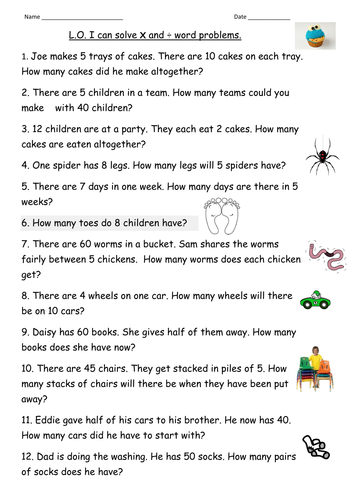 They make a great group activity to deepen understanding. Multiplication related facts to 10x10 e.g. Understanding division dividing by 2, 5 and 10 more division including halving and word problems. Number and place value addition subtraction multiplication division four operations fractions money measurement time geometry (shape) statistics (handling data) reasoning/problem solving weekly programme year 2 assessment This is a handy pack of worksheets containing multiplication and division word problems.